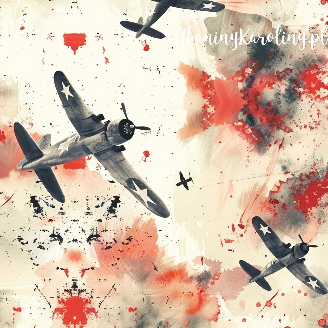 Wzór wojskowy, dla wielbicieli militariów. Samoloty przedstawione na obrazie olejnym w towarzystwie czarnych rozprysków.