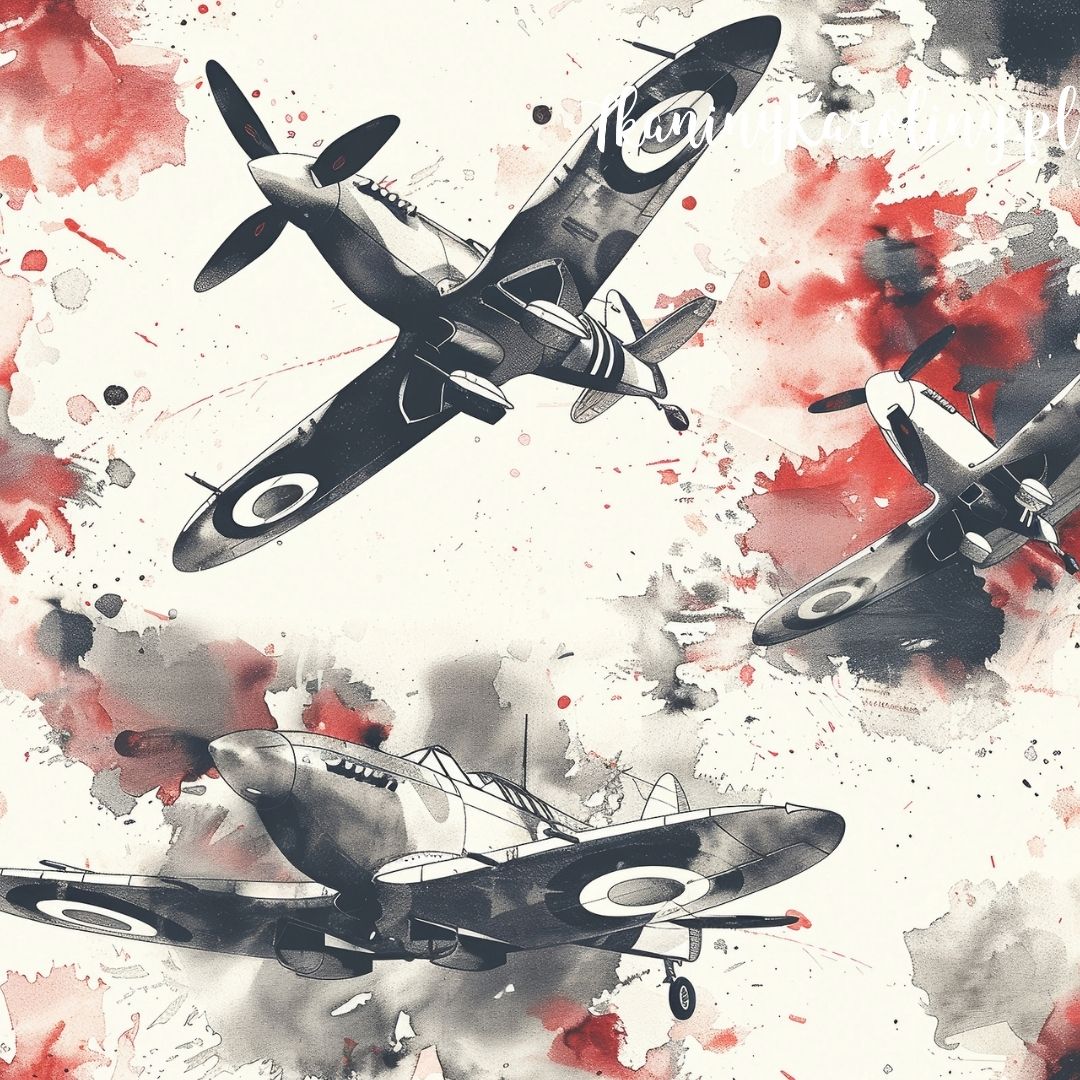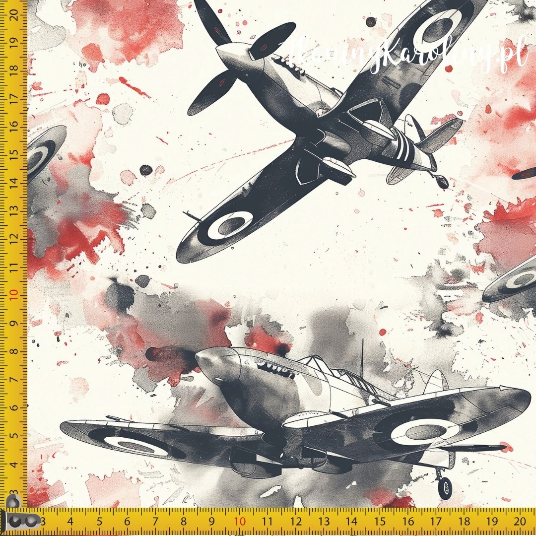 WELUR TAPICERSKI Wojskowy - samoloty w czerwonych plamach na jasnym beżu, akwarela [6-8]