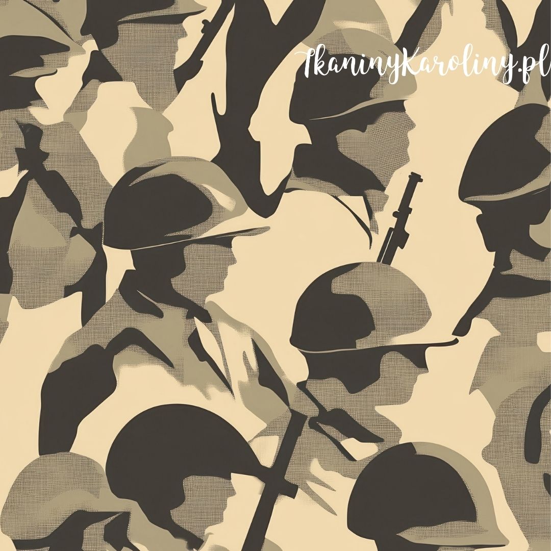 Wzór wojskowy, dla wielbicieli militariów. Przyjemny dla oka, stonowany wzór na beżowym tle.