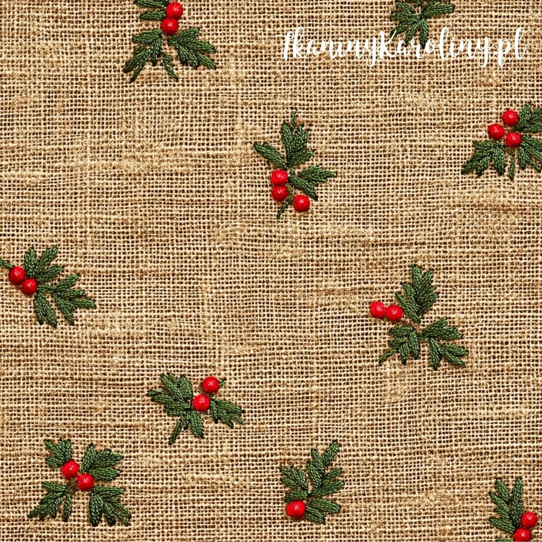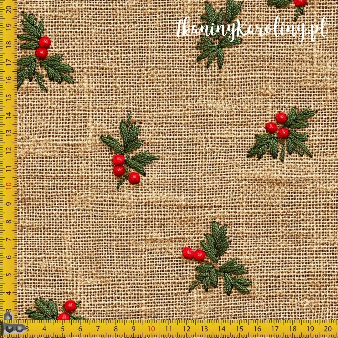 Grafika ręcznie wyhaftowanego ostrokrzewu na tle beżowej juty w wersji welurowej – piękny, miękki i praktyczny do wszelkich projektów dekoracyjnych! Idealny na trwałe, wielorazowe i piękne świąteczne woreczki prezentowe i akcesoria.