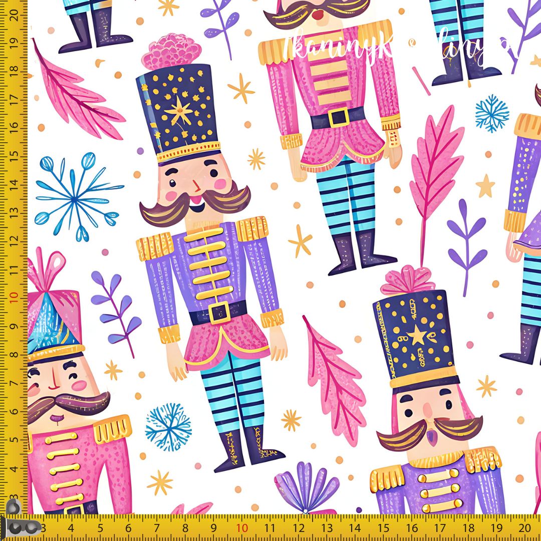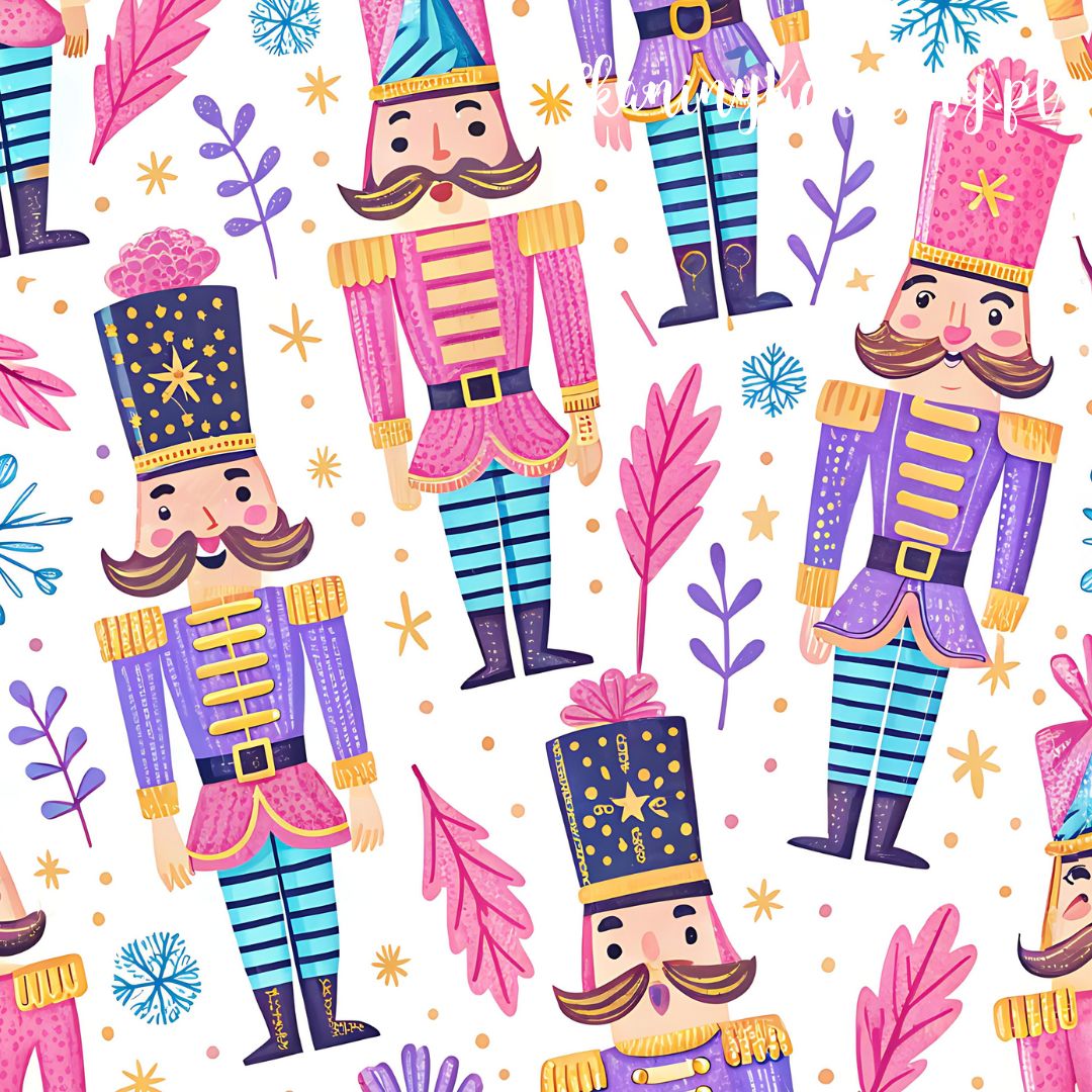 Kolorowe dziadki do orzechów w różowych i fioletowych uniformach, otoczone drobnymi gwiazdkami, płatkami śniegu i dekoracyjnymi liśćmi. Wzór jest radosny, bajkowy i pełen świątecznego uroku – idealny na tkaniny dekoracyjne, świąteczne czy akcesoria dla dzieci.